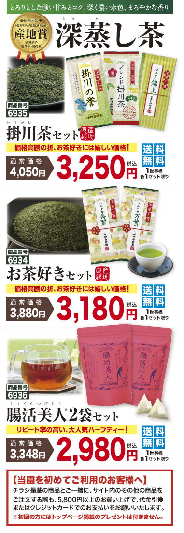 ※掛川茶セットと腸活美人 2袋セットを購入した場合は、システム上の関係で、チラシ表示価格より1円お値引きした6,229円にて販売させていただきます。
