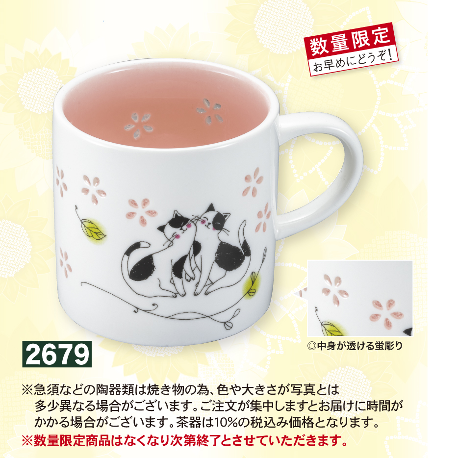 蛍彫りマグ 花とネコ(赤)